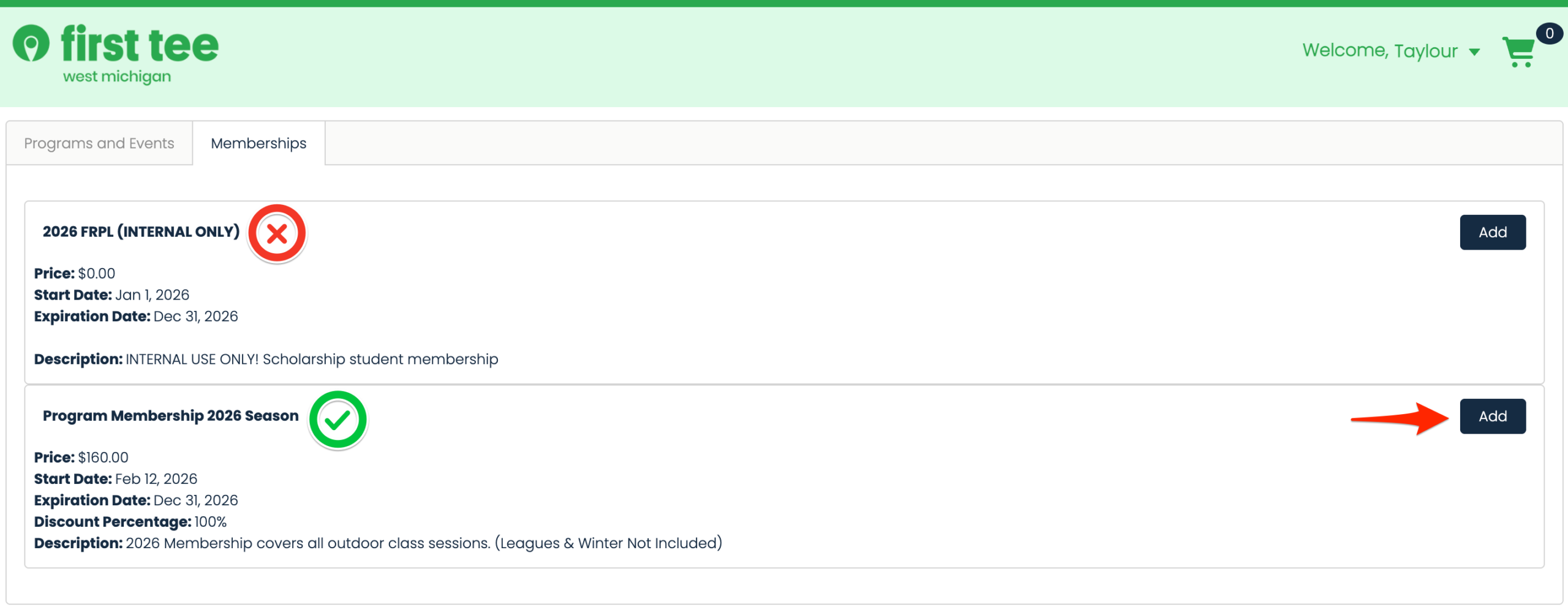- Before checking out add the “Program Membership 2026 Season” to your cart