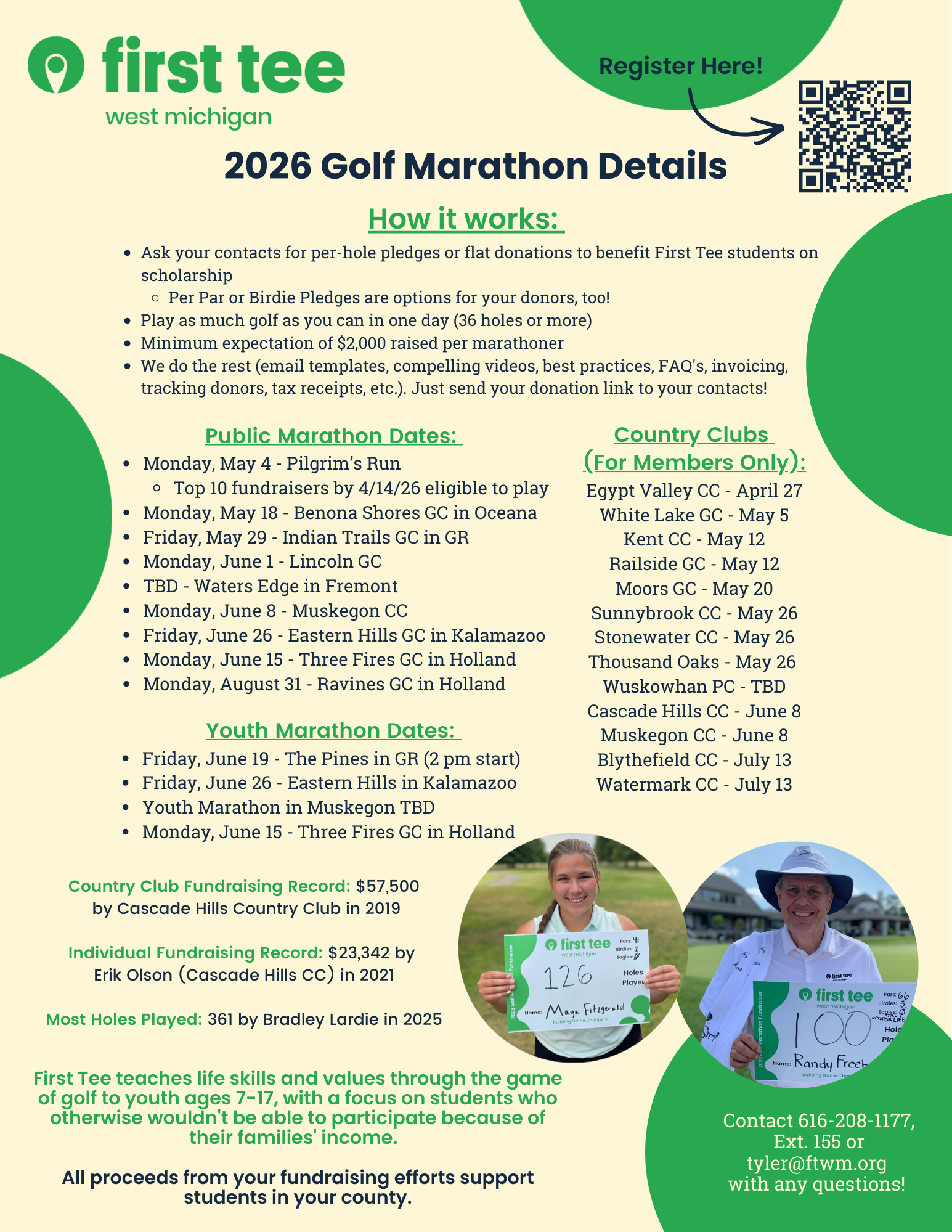 The golf marathon is First Tee – West Michigan’s biggest fundraiser of the year! Every year, we host our marathons at both private and public courses across West Michigan, raising money for our students on scholarship so more kids & teens in West Michigan can access our program for free.