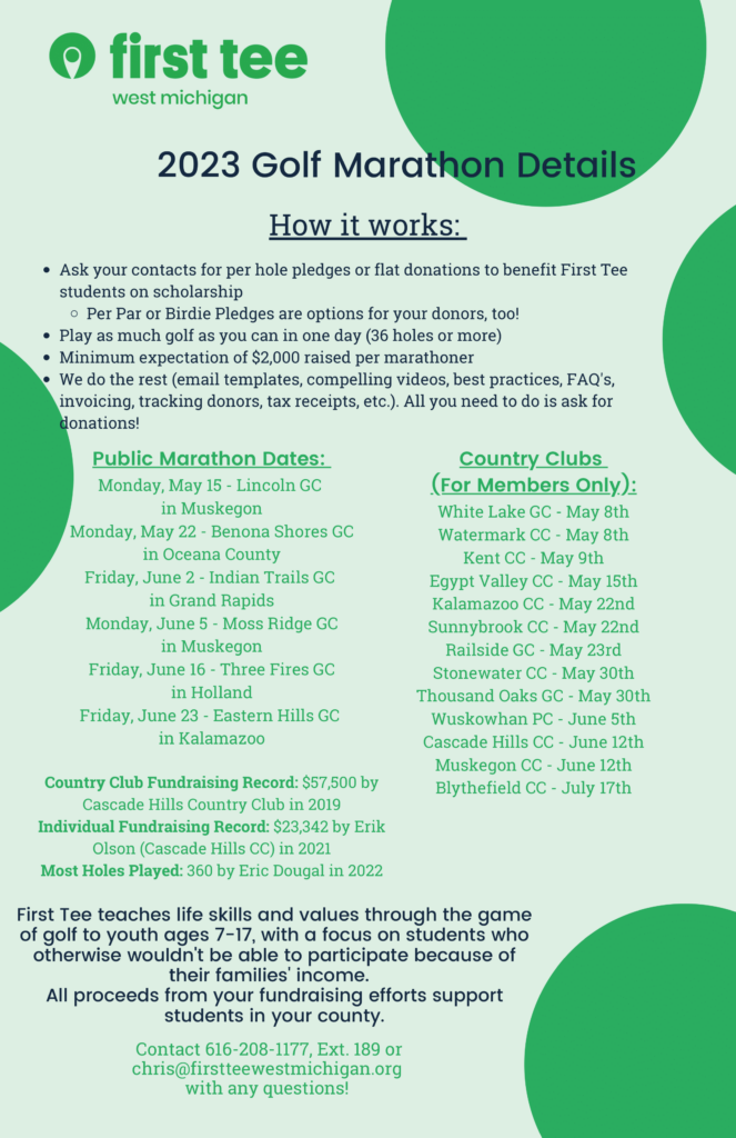 The golf marathon is First Tee – West Michigan’s biggest fundraiser of the year! Every year, we host our marathons at both private and public courses across West Michigan, raising money for our students on scholarship so more kids & teens in West Michigan can access our program for free.