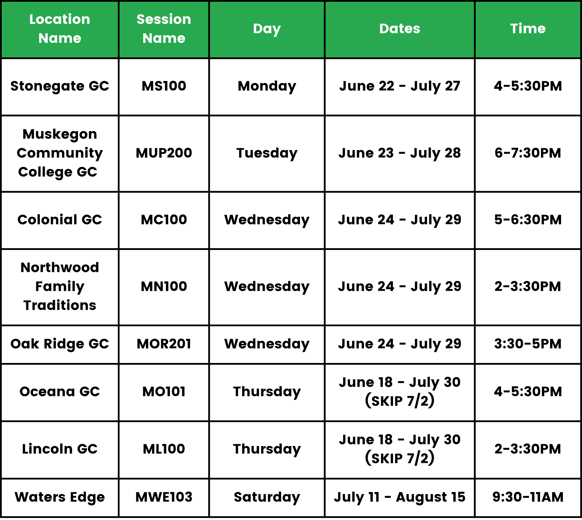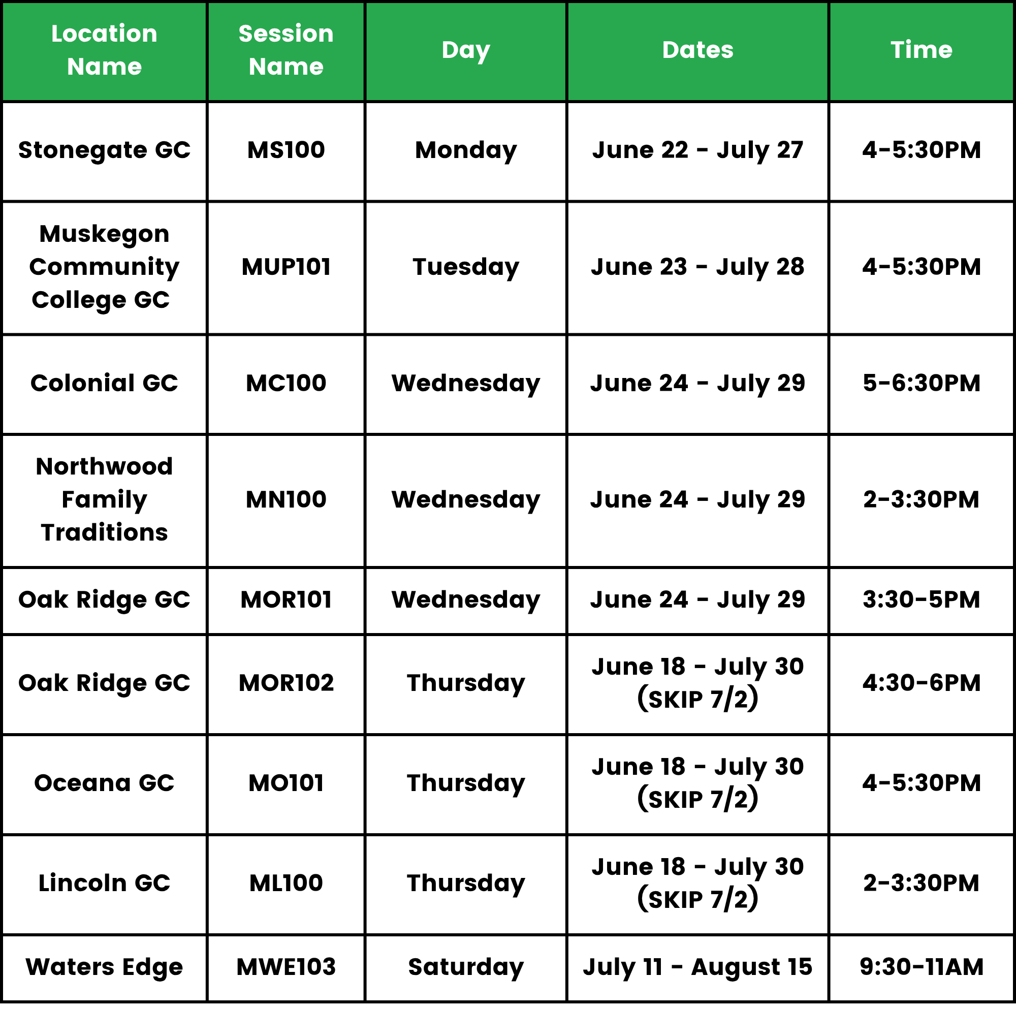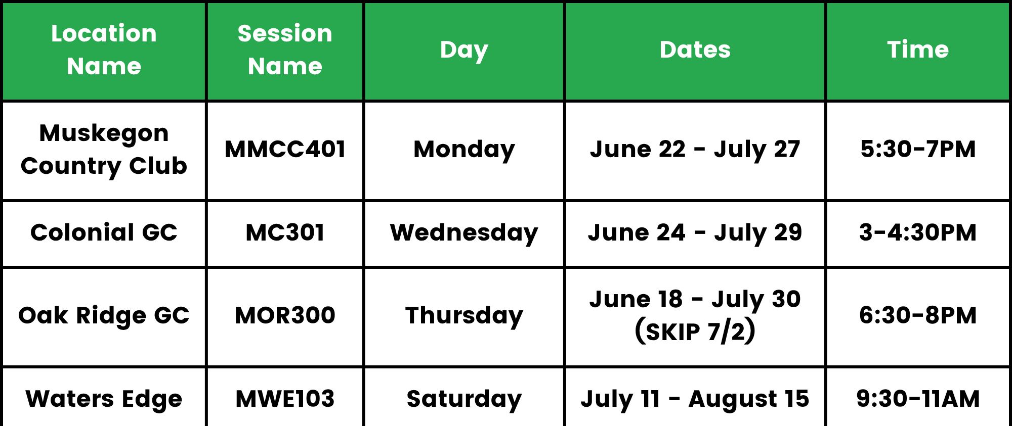 Join us for our girls only golf program at Muskegon Country Club! Introduce your daughter to golf in a female led class. We will teach the game of golf in a fun, safe, and empowering environment. This class is designed to accommodate new and returning golfers.